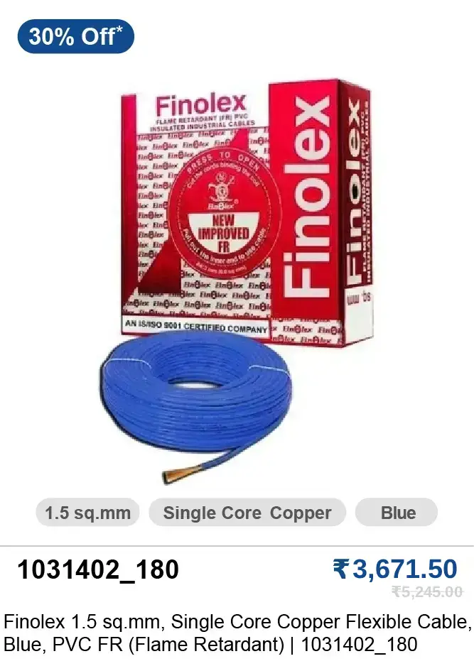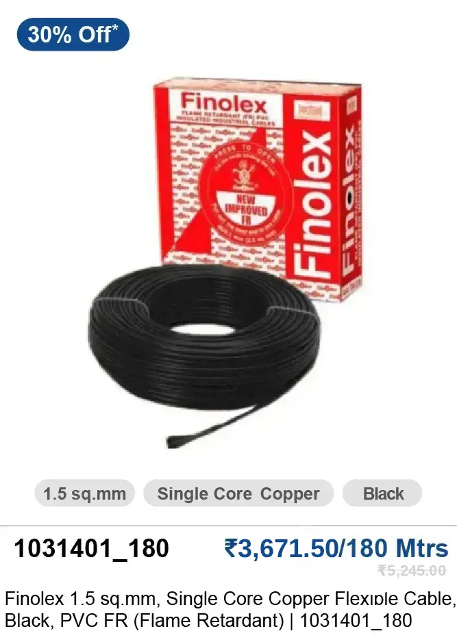 Eleczo, your trusted online platform for premium electrical solutions, offers durable and reliable 1.5 sq mm electric wires at competitive prices. Designed for both domestic and commercial wiring, our range includes trusted brands like Finolex, Lapp Kabel, and more—ensuring lasting performance and maximum safety. We keep our pricing transparent to reflect the latest 1.5 mm copper wire price in India. Explore a variety of colors and specifications to match your needs, and enjoy GST benefits on bulk purchases with fast, on-time delivery across India.