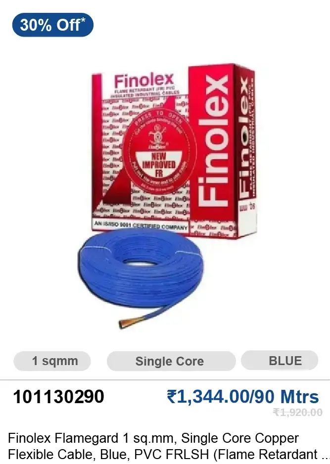 | Finolex Flamegard 1 Sq Mm Blue Single Core Copper Flexible Wire 1011302 | 30.00% | Rs.1,344.00/- 90 Mtrs |