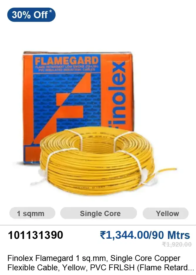 | Finolex Flamegard 1 Sq Mm Yellow Single Core Copper Flexible Wire 1011313 | 30.00% | Rs.1,344.00/- 90 Mtrs |