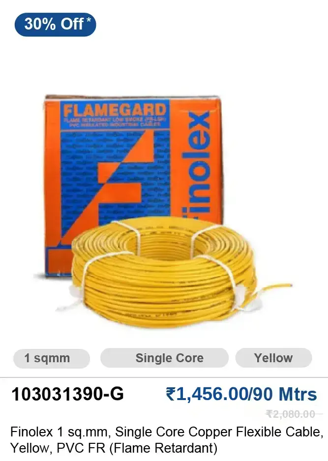 | Finolex 1 Sq Mm Yellow Single Core Copper Flexible Wire 1031313 | 30.00% | Rs.2,513.00/- 180 Mtrs |