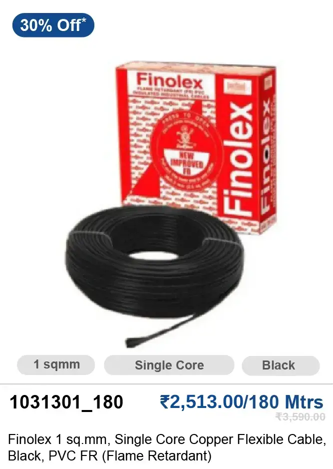 | Finolex 1 Sq Mm Black Single Core Copper Flexible Wire 1031301 | 30.00% | Rs.2,513.00/- 180 Mtrs |