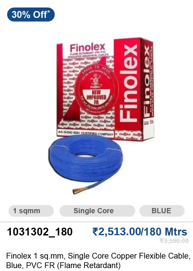 | Finolex 1 Sq Mm Blue Single Core Copper Flexible Wire 1031302 | 30.00% | Rs.2,513.00/- 180 Mtrs |