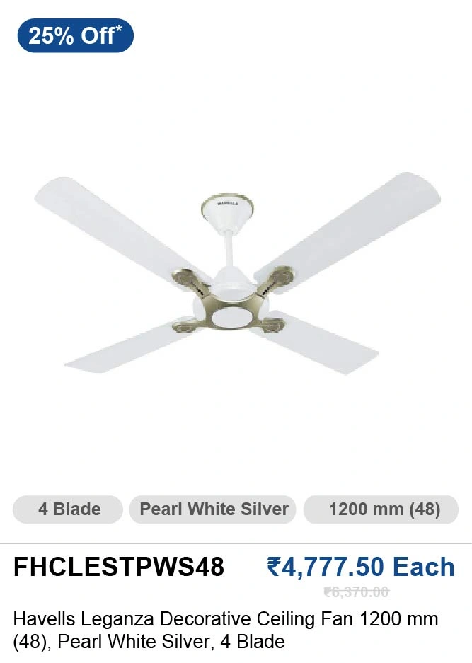 | Havells Leganza 1200 Mm (48 Inch) 4 Blade Pearl White Silver Decorative Ceiling Fan FHCLESTPWS48 | 25% | Rs.4,777.50 |