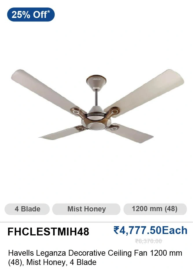 | Havells Leganza 1200 Mm (48 Inch) 4 Blade Mist Honey Decorative Ceiling Fan FHCLESTMIH48 | 25% | Rs.4,777.50 |