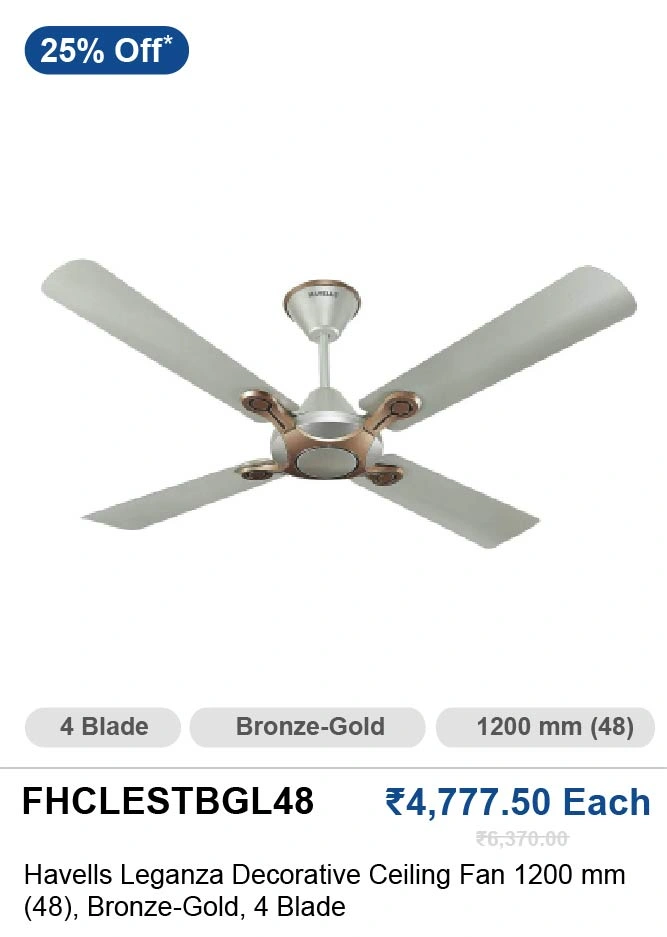 | Havells Leganza 1200 Mm (48 Inch) 4 Blade Bronze-Gold Decorative Ceiling Fan FHCLESTBGL48 | 25% OFF/- | Rs.4,777.50/- Each |