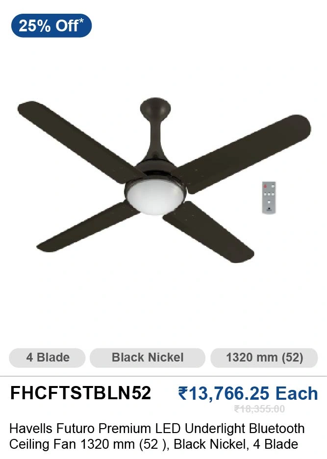 | Havells Futuro Premium 1320 Mm (52 Inch) 4 Blade Black Nickle LED Underlight Bluetooth Ceiling Fan FHCFTSBLN52 | 25% OFF/- | Rs.13,766.25/- Each |